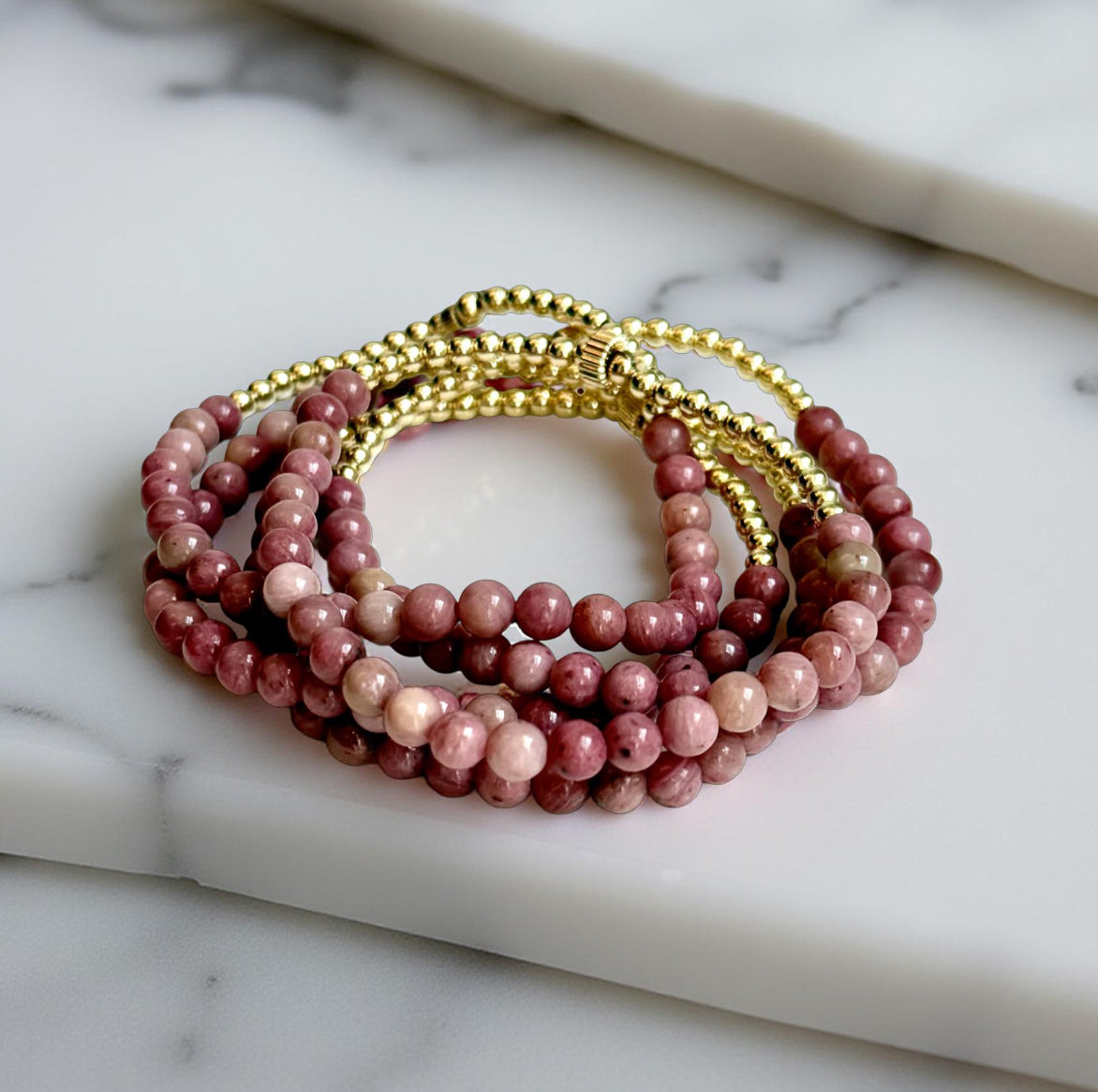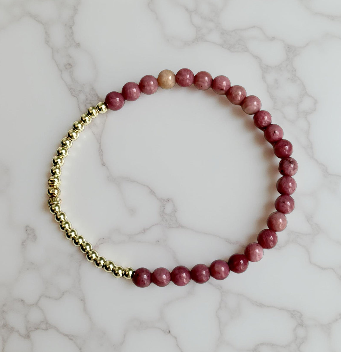 - Made with 3mm 14K gold filled round beads & 4mm pink rhodonite natural round beads.