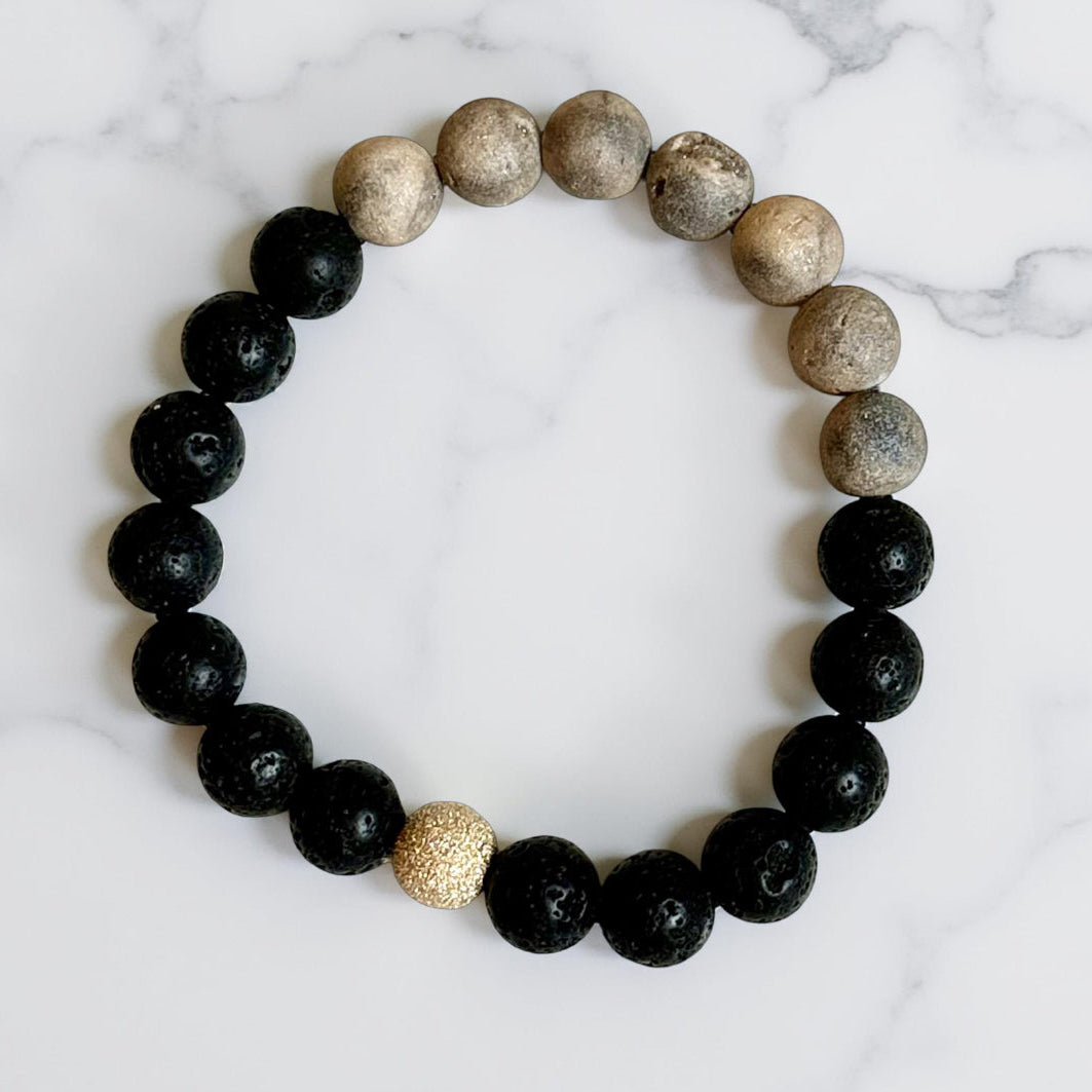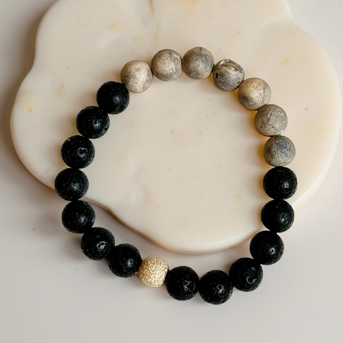 - Made with 8mm black lava stone beads , 8mm cream agate beads and 8mm gold filled stardust bead.