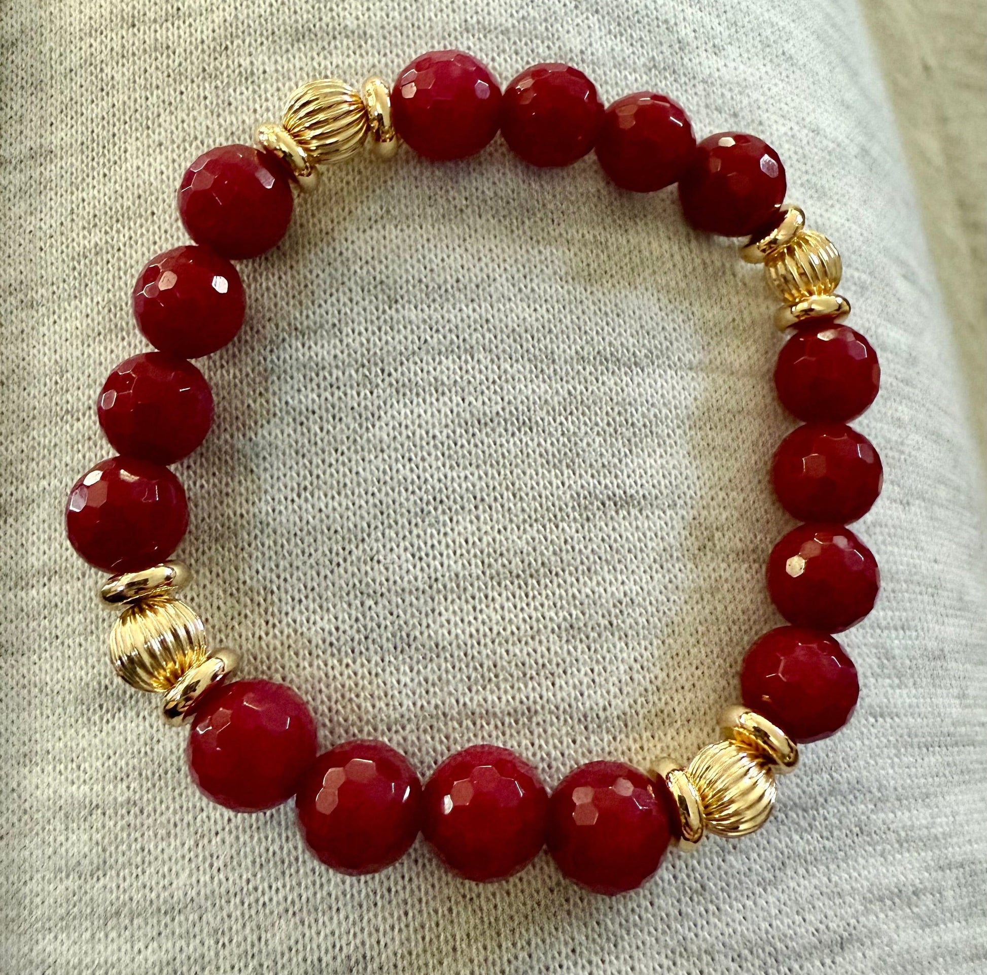 - Made with 8mm Ruby Jade Faceted beads, 4mm 14k gold filled spacer beads, 8mm 14k gold filled corrugated gold filled bead.