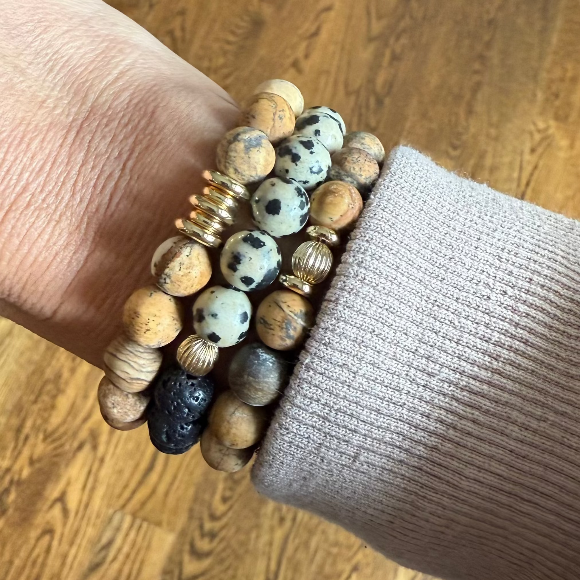 - Made with 8mm jasper beads, 6mm and 8mm 14k gold spacers and 14k gold corrugated round bead.