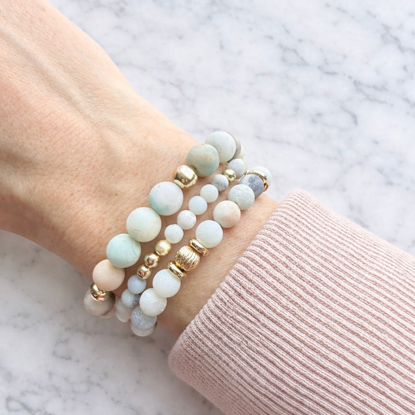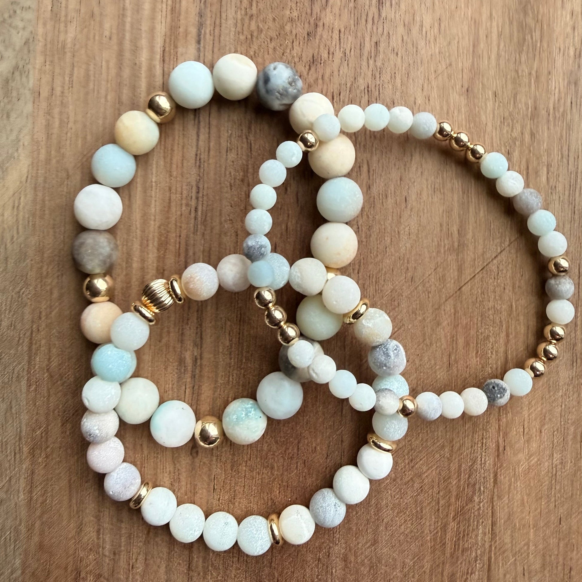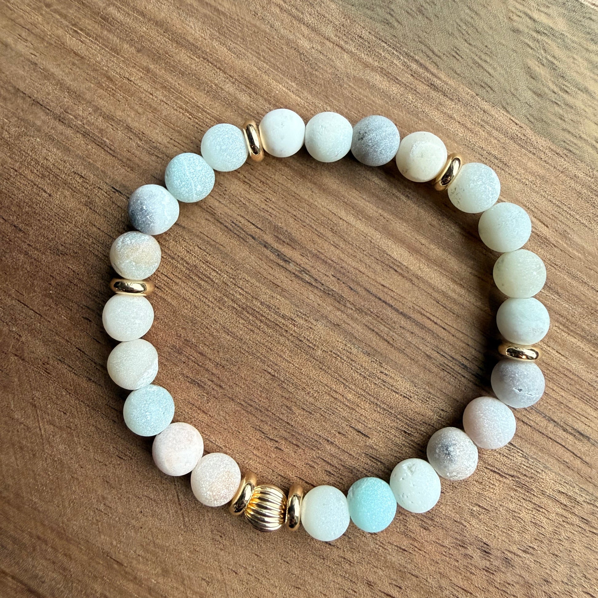 - Made with 6mm Amazonite beads, 6mm 14k gold filled round beads and 6mm gold filled corrugated bead.